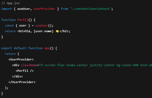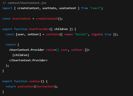 Com isso, qualquer componente dentro do UserProvider tem acesso direto ao estado global — sem precisar repassar props.